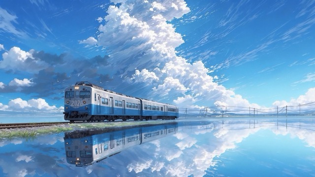 A retro commuter train in blue and white, with warm yellow headlights and the number "2026" on its front. It has four carriages, the train body has a delicate metallic texture, and the windows reflect light as it travels along narrow tracks. The tracks are dotted with small patches of green grass. The train occupies about 30% of the frame, positioned on the lower left, conveying a sense of forward motion. Reflection Subject: The train and the sky are reflected symmetrically in the mirror-like water below, forming a clear and complete 1:1 reflection, enhancing the symmetrical aesthetics of the image.
