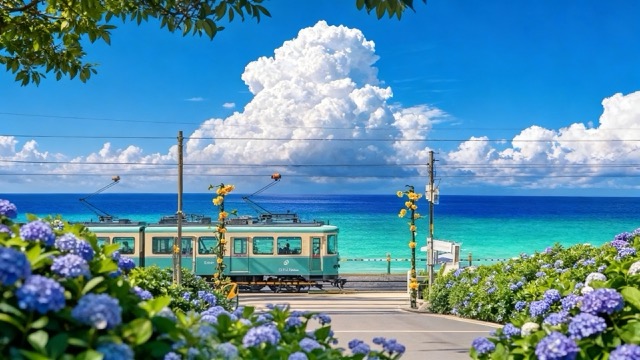 On a bright summer afternoon, the horizon is a clear, azure blue, dotted with fluffy rain clouds. The sea's color gradients from cobalt blue to emerald green. A mint green vintage tram cuts across the mid-ground, while hydrangea bushes fill the foreground.