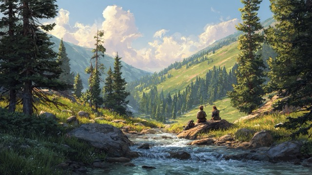 A crystal-clear mountain stream flowing through a lush green valley surrounded by tall pine trees. Two small figures sitting on a rock beside the stream in the midground. Foreground detailed rocks and flowing water with visible ripples and white foam. Midground dense evergreen trees framing the scene on both sides. Background rolling bright green hills under a clear blue sky with soft clouds. Warm late afternoon sunlight casting natural shadows across the hills. High clarity atmosphere, vibrant summer greens, cinematic depth perspective, ultra detailed landscape textures, realistic water reflections, 4K, vertical composition, travel photography style.