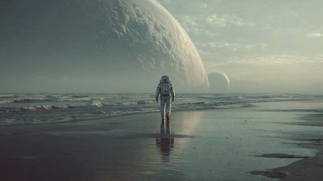 Astronaut walking through shallow reflective water on a distant exoplanet. Giant planet rising over the horizon, subtle tidal waves forming in the distance. Overcast cinematic lighting, soft reflections on water surface, muted desaturated color grading. Ultra realistic physics simulation, large scale environment, atmospheric haze, epic sci-fi realism, IMAX framing, 4K.