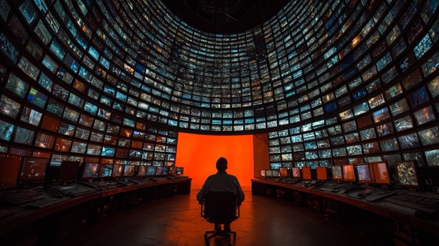 A man sitting at a desk inside a massive circular tunnel lined entirely with illuminated screens. Hundreds of monitors curve around him forming a cylindrical wall of data and visuals. View from slightly above and behind the man. Strong central vanishing point perspective. The tunnel narrows toward a glowing red screen at the far end. Dark environment illuminated only by the glow of countless screens. Warm orange and cool blue monitor lights reflecting on walls and subject. Retro-futuristic control room, information overload atmosphere, cinematic sci-fi aesthetic, dramatic depth perspective, ultra detailed screens, grainy film texture, high contrast lighting, 4K, symmetrical composition.