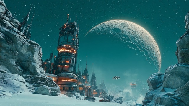 Cinematic sci-fi moon base on a frozen alien landscape, ultra detailed futuristic tower structure built into rocky cliffs. Massive crescent planet dominating the sky, highly textured surface with visible craters. Deep blue space background filled with sharp stars. Tall industrial space tower with antennas and glowing orange interior lights, realistic hard-surface sci-fi design, intricate mechanical details, pipes, ladders, layered architecture. Snow-covered ground and jagged rocks in foreground forming natural frame. Small spaceship hovering mid-air near the base, subtle engine glow. Cold teal color grading with warm light contrast from windows. Atmospheric perspective, soft volumetric glow around the planet rim. Epic scale, vertical composition, low angle perspective, ultra high detail, sharp focus, 8K resolution, cinematic lighting, sci-fi concept art, realistic rendering, Unreal Engine style, dramatic mood.