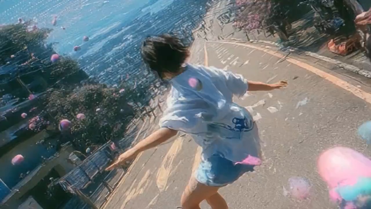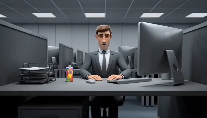 A colorful 3D cartoon advertisement, playful energy, vibrant lighting. Shot 1 (0–2s): Dull office scene, person tired, low saturation colors. Shot 2 (2–4s): Close-up — hand grabs bright juice box. Shot 3 (4–6s): Drinks — sudden burst of color explosion around. Shot 4 (6–8s): Environment transforms into fun animated world, fruits bouncing. Shot 5 (8–10s): Character dancing energetically with animated objects. Shot 6 (10–12s): Juice box floating in air, glowing. Shot 7 (12–15s): Hero shot — product centered, vibrant background, clean finish. Style: glossy textures, bright colors, smooth animation, energetic pacing.