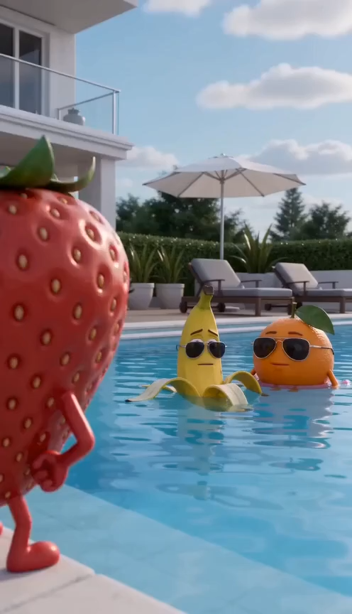 Vertical TikTok-style video of anthropomorphic fruit characters in a glossy 3D animated world, performing a dramatic romance or relationship scene like a viral love reality show. The main fruit character has big expressive eyes, small limbs, vivid facial emotions, and cute but exaggerated acting. Social-media-style and dramatic zoom-ins, over-the-shoulder shots, reaction cuts, and emotional close-ups. Bright saturated colors, soft studio lighting, polished cartoon 3D textures, highly stylized and visually playful. The characters flirt, argue, confess, gossip, get jealous, or react to relationship drama in a funny and exaggerated way. Tone is cute, chaotic, emotional, comedic, and addictive to watch. User can add custom fruit characters, setting, storyline, dialogue, or twist. An anthropomorphic Strawberry lady confronts Banana man after discovering them with Orange lady soaking in pool. Strawberry lady feels betrayed and emotional, Banana man becomes nervous and defensive, and Orange lady acts confident or provocative. Dramatic reaction shots, emotional close-ups, fast-paced reality-show energy, bright saturated colors, glossy cartoon textures, expressive facial animation, lip-sync dialogue, chaotic romantic tension. Strawberry lady says to Banana man: “You poor man ! You live my house, drive my cars, use my money,! How dare you cheat me! How dare you spend my money to others!” The banana man get embarrassed after this and says “Im using my money” The orange lady figured out she was cheated by the banana man, says to him angerily “You lier! You told me you are single. Go to hell!”.