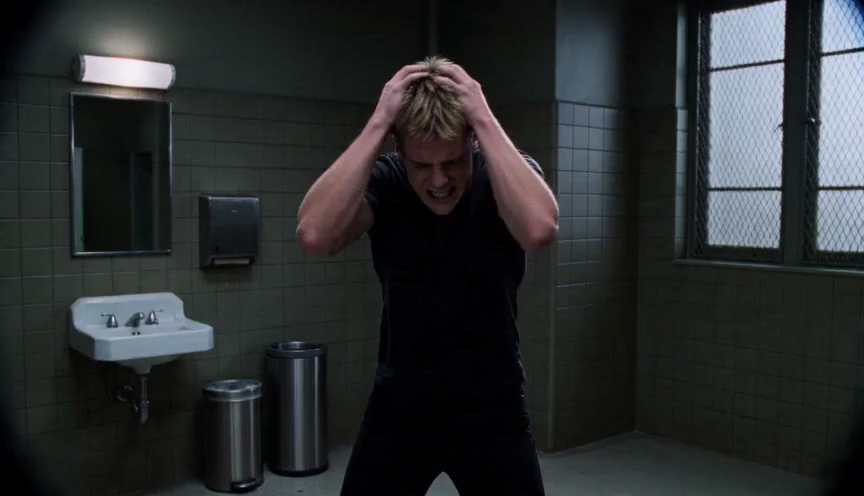 A dramatic intense scene, camera spin 360° around a male blond young adult, he is in pain as his bones dislocate and skin ripple, camera captures the intricate details as his body transforms gradually. His jaws gradually elongate like a dire bear, his body gradually grows bigger and muscular as his clothes rips while his body gets bulky and muscular gradually his whole body gets covered with thick wild wolf fur and he transforms into a brown bear. Camera captures his facial expressions while the camera dynamically orbits around him, crash zoom in and out focusing on his facial expressions and body, anamorphic lens, 35mm flim, lens glare a cinematic masterpiece, ere dimly lit environment of washroom