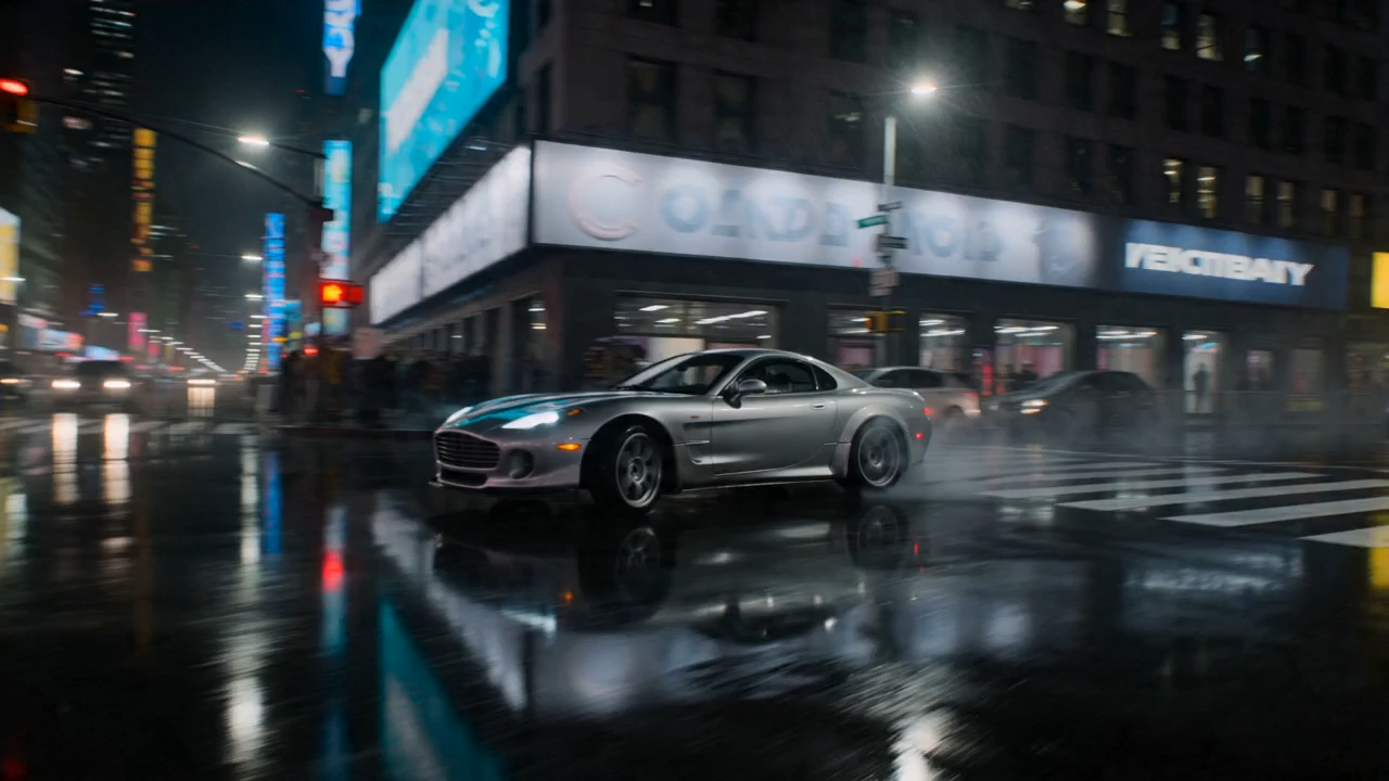 A cinematic street racing scene at night, a silver sports car drifts through a neon-lit city intersection, sparks flying from the tires, smoke trailing behind, the driver sharply turns the wheel and accelerates toward the camera, fast dolly tracking shot, low-angle wheel close-up, then a rapid whip pan transition to a wide aerial shot of the car speeding through rain-slick streets, dramatic motion blur, intense reflections, adrenaline-filled atmosphere, realistic lighting, high contrast, premium action movie style, smooth camera motion, consistent vehicle shape, no deformation, no extra cars merging into the subject, ultra-detailed.