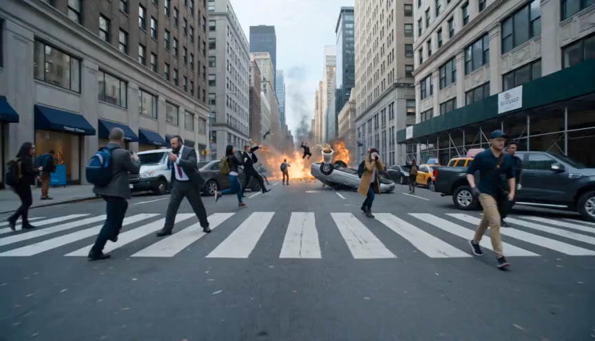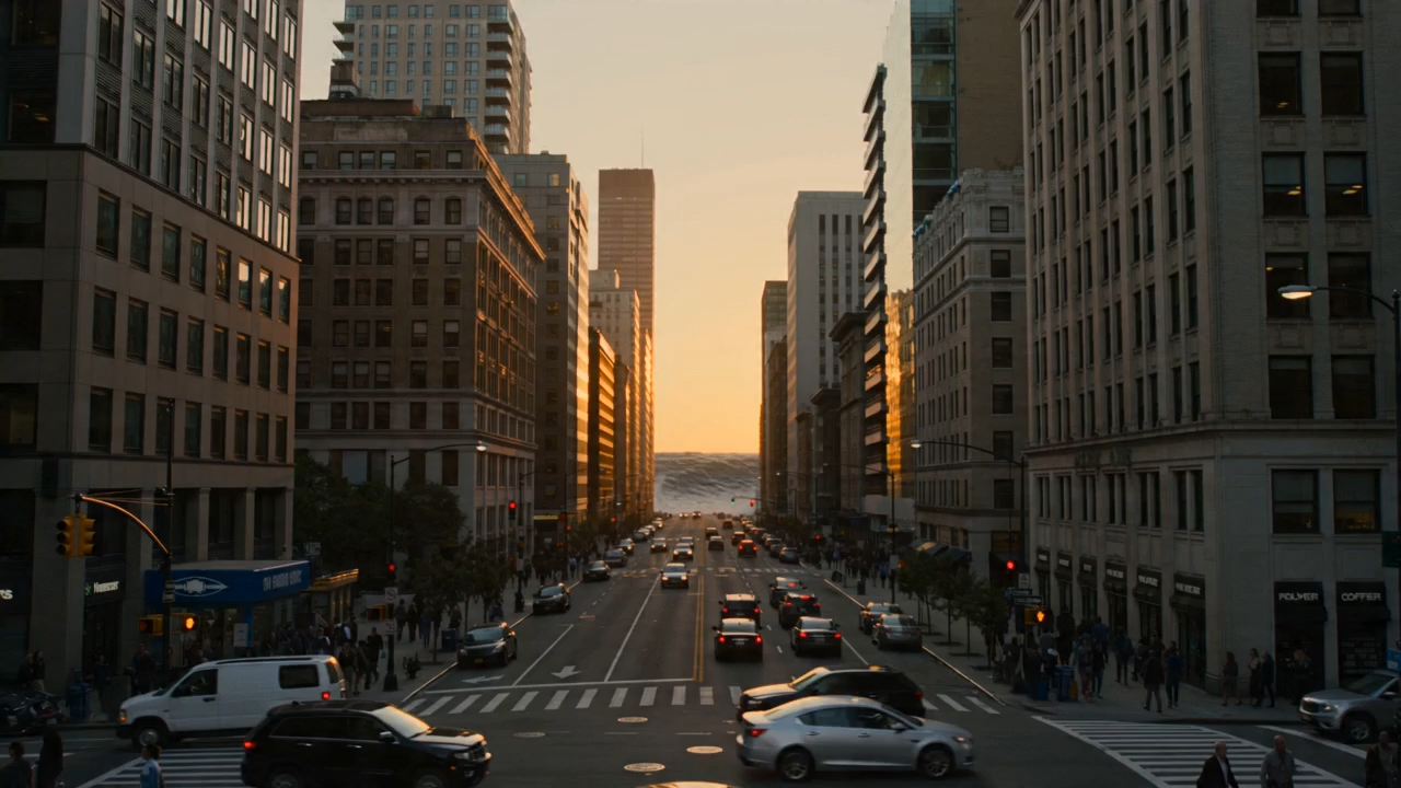 A modern city street at sunset, people and cars move normally for a brief moment, then a gigantic ocean wave suddenly rises between the buildings and rushes forward in the first second, water reflecting golden light, dramatic scale contrast, fast wide-to-close cinematic move, visually shocking, realistic lighting, no warped buildings, no duplicate people.