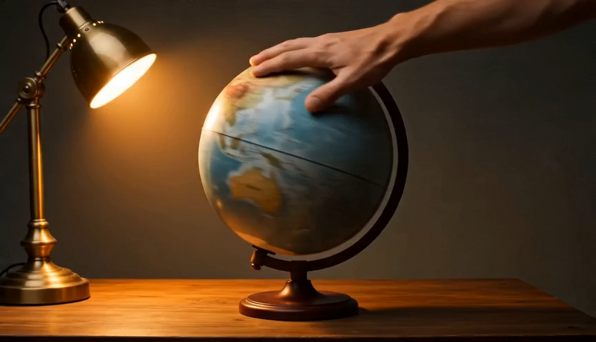 [CINEMATIC SETUP] Film Style: Photorealistic 8K, 50mm anamorphic. Brass desk lamp casting hard amber light from screen-left onto a walnut desk. Fast editorial montage — snap-zoom between globe surface and civilization vignettes. Camera: Locked on desk for globe shots. Snap-zoom push-in for vignettes, snap-zoom pull-out to return. [TIMELINE — MONTAGE] 0-1s: DESK. A detailed globe on a walnut desk under lamp light. A hand spins it. 1-3s: Globe stops on Middle East. Snap-zoom in — painted surface dissolves into photorealistic aerial of irrigated farmland, ziggurats, oxen plowing mud. Golden dust. SFX: wind, chanting. 3-5s: Snap back to desk. Hand flicks globe. Stops on Africa. Snap-zoom in — ground-level view of Djenne mud mosque, gold traders crossing a market square, indigo-robed horsemen. SFX: drums, chatter. 5-7s: Snap back. Spin. Stops on South America. Snap-zoom — Machu Picchu at sunrise, terraces descending into cloud forest, condors circling. SFX: mountain wind, distant flute. 7-9s: Snap back. Spin. Stops on Europe. Snap-zoom — medieval battlefield, cavalry charging across mud, siege towers rolling toward a fortress, catapult arcs. SFX: hooves, metal clash. 9-11s: Snap back. Spin faster. Stops on East Asia. Snap-zoom — coastal trading port, wooden junks in harbor, silk bales on a wharf, fireworks above a pagoda. SFX: firecrackers, bells. 11-13s: Snap back. Hard spin. Stops on North America. Snap-zoom — Manhattan assembling in timelapse, steel girders rising, bridges spanning, electric lights flooding the grid. SFX: riveting, electric hum. 13-15s: Snap back. Hand lifts globe off stand. Lamp flickers off. Globe dissolves into photorealistic Earth from orbit — city lights blazing, a rocket trail arcing into space. Hand opens, Earth floats free. SFX: silence, single low tone. [QUALITY] Photorealistic 8K. Desk consistent as anchor between vignettes. Snap-zoom bridges painted globe to real landscape through shared geography. Each vignette 3-4 details, one primary motion. No text overlays. Consistent lamp color on desk returns.