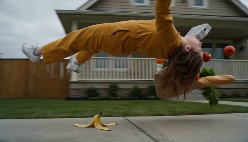 Bullet time effect. A young woman in a mustard-yellow jumpsuit slipping and falling backward on a suburban sidewalk in front of a modest house with a wooden fence. A banana peel lies on the ground beneath her, implying the cause of the fall. Groceries burst out of a paper bag mid-air—fresh vegetables, tomatoes, oranges, leafy greens, a baguette, and an egg carton—all suspended in perfect stillness. Her body is tilted horizontally, limbs flailing, facial expression shocked and wide-eyed. All objects—food, packaging, and debris—are frozen in time, floating around her. The environment remains completely still while the camera smoothly orbits 360 degrees at a low angle, emphasizing the dramatic fall. Cinematic composition, overcast natural lighting, shallow depth of field, slight wide-angle lens distortion for dynamic perspective, highly detailed textures, photorealistic style.