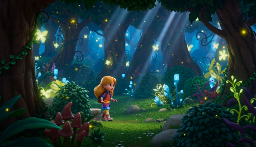 A stylized 3D animated fantasy adventure with a cute brave young explorer, big expressive eyes, small backpack, colorful outfit, magical forest environment, playful cinematic lighting, high-quality 3D animation, charming family-friendly tone, exciting action, clear storytelling, dynamic framing, cute but epic mood, hard cuts only, no fade, no dissolve, no morph transition Shot 1: Wide shot of a cute young adventurer entering an enchanted forest, glowing plants, floating fireflies, curious expression Cut to Shot 2: The hero finds an old treasure map glowing on a stone altar, eyes lighting up with excitement Cut to Shot 3: Medium shot of the hero running through the forest, jumping over roots and ducking under branches Cut to Shot 4: The hero arrives at a mysterious cave hidden behind vines, golden light glowing from inside Cut to Shot 5: Inside the cave, a funny but dangerous witch appears in a swirl of green magic, blocking the treasure chest Cut to Shot 6: Action shot, the hero dodges a magical spell and uses a glowing crystal slingshot or magic charm to fight back Cut to Shot 7: The witch is defeated in a burst of sparkles, her broom spinning away harmlessly Cut to Shot 8: The hero opens the treasure chest and finds a glowing magical gem and piles of gold Cut to Shot 9: Final heroic shot of the cute adventurer holding the treasure proudly at the cave entrance as sunlight breaks through the trees