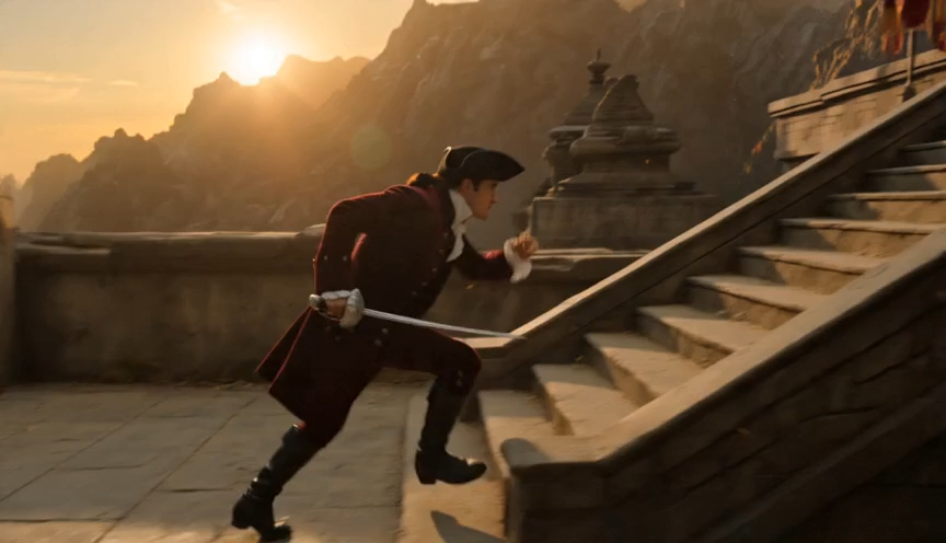 Dawn light floods Whispering Peaks Monastery courtyard, monks in crimson robes mid-ritual as Captain Aurelius Blackwood, in a burgundy velvet coat, stands at the base of the steep staircase. Low, close-up camera captures a monumental climb as he draws his sword, sprints up, boots echoing on ancient stone. Midway, he leaps off the crumbling archway, grabs the prayer flag rope, and swings over a twenty-foot drop, camera tracking his arc urgently. At peak, he releases, crashing onto a narrow terrace, rolling to a knee, sword ready, eyes fierce. Off-screen voice shouts CUT, scene elements soften. Camera slow pullback reveals set edges – a painted green-screen panel, crew amid lighting rigs, and camera dollies. Blackwood exhales, drops sword, fans face with tricorn hat, accepts towel, water from crew member. He chuckles, drinks, glances at the artificial monastery under studio lights. Initially tight on Blackwood, low-angle camera tracks movements, gradually widening to show industrial Hollywood soundstage scale. Golden light within the set cools as the reveal progresses, shifting from warm amber to flat white-gray of studio illumination, fog effects, and fluttering flags hinting at behind-the-scenes efforts. Soundscape of boots, rope creaks, rushing wind shifts to studio silence post-CUT, ambient crew sounds punctuated by water bottle cap click. Final frame captures monastery mini-set, warm gold glow against filmmaking machinery backdrop. Blackwood mid-frame, relaxed, back half-turned, water bottle in hand, towel over shoulder, coat details catching overhead light, while a monk in crimson robe checks phone — quiet end to the now dissolved illusion.