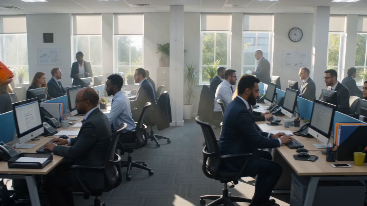 A normal open-plan office in bright daylight, people typing at desks and walking naturally, then a giant elegant goldfish suddenly swims through the air between the desks as if the entire room were underwater, papers float gently, office workers pause and stare in amazement, whimsical surrealism, playful and visually delightful, smooth lateral tracking shot, light beams, floating dust, absurd but charming, highly shareable, no fear, no chaotic crowd glitches, no warped fish anatomy.