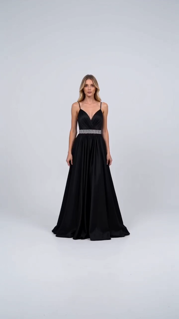 A stylish woman stands in the center of a clean studio space wearing an elegant flowing gown, she spins once and the dress color changes instantly from black to red to gold to icy blue in rapid succession, fabric moving beautifully, glossy lighting, smooth fast camera orbit, luxurious and hypnotic fashion visual, no face drift, no dress deformation, no extra arms.