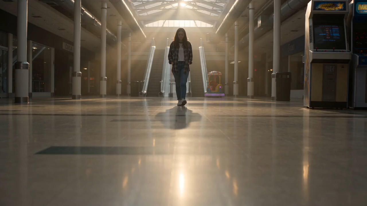 An empty suburban shopping mall at dusk, soft pink and yellow sunset light spills through the skylight, glossy floors reflect old arcade lights, a lone young woman in vintage casual clothes walks slowly through the silent corridor, distant escalators move with no one on them, a children’s coin ride blinks softly in the background, dreamy nostalgic atmosphere, slightly uncanny but beautiful, slow cinematic push-in, liminal space aesthetic, soft haze, gentle camera drift, familiar but strange, no horror elements, no face distortion, no extra people appearing, ultra-detailed.