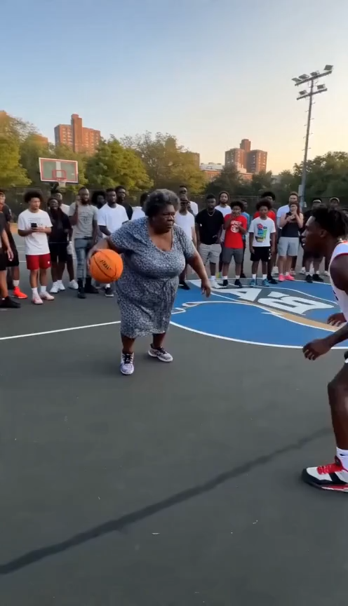 Raw mobile phone footage, vertical handheld shot, shaky cam, grainy texture. At the legendary Rucker Park basketball court at dusk, a heavy-set elderly woman in a floral dress and sneakers is dribbling a basketball against iShowspeed (a influencer), athletic streetballer in a jersey. The lady performs a lightning-fast crossover dribble, blowing past the stunned defender (iShowspeed). She suddenly drives to the hoop and performs a powerful, explosive two-handed slam dunk, hanging on the rim briefly. The surrounding crowd of teenagers and streetball fans goes wild, storming the court in a chaotic celebration. Lens flares, motion blur, authentic street lighting, high energy, viral social media video aesthetic.