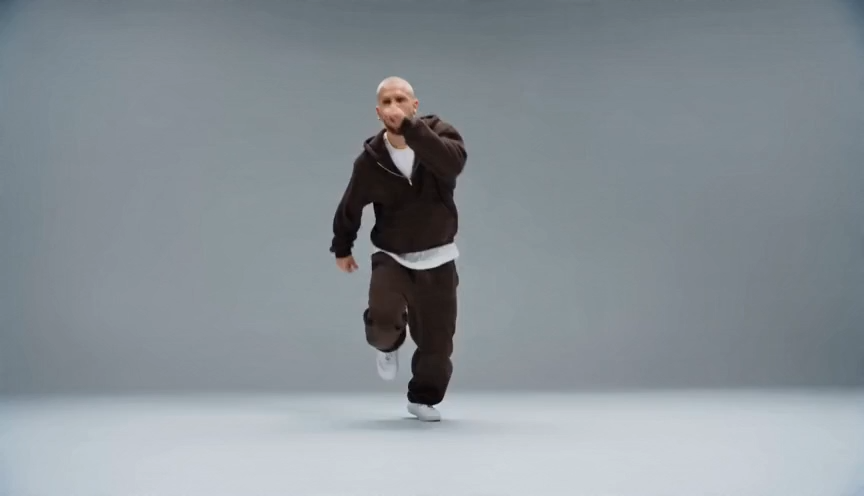 SUBJECTS: A male street dance expert, white buzz cut, wearing small gold hoop earrings and a gold rope chain. Dressed in a dark brown hoodie, a pure white crew neck shirt underneath, dark brown loose pants, and white sneakers. ENVIRONMENT: Pure seamless background, slightly cool gray tone, clean space with no distractions. STYLE: cinematic realism, studio dance film, high contrast clean lighting Timeline 0:00-0:02: Full body, 24mm, low-angle fast push-in The dancer bursts directly into motion at high speed, right foot stomping the ground while the body performs a powerful rotation, left leg sweeping wide to create large spatial displacement, upper body hits and releases in sync 0:02-0:03: Full body, 28mm, tracking side move He performs continuous large cross steps and sliding combinations, feet rapidly crossing while driving lateral movement, the jacket swings with strong inertia from the motion 0:03-0:05: Full body, 28mm, orbit He transitions into continuous rotating footwork, rapidly switching pivot points with both feet to achieve multiple directional changes, forming an arcing trajectory in space 0:05-0:06: Low angle, 24mm, forward pressure He suddenly drops low, one hand touching the ground for support, quickly transitioning into floor movement 0:06-0:07: Low near-ground angle, 24mm, tracking Both legs sweep rapidly to complete a full power sweep rotation, the body forming a high-speed circular motion around the supporting arm, then using the momentum to spring back up 0:07-0:08: Full body, 28mm, tilt up He explosively rises from the ground, landing on both feet and immediately executing a full-body wave, while continuing to move forward 0:08-0:10: Half body to full body, 35mm, forward tracking He enters a high-speed pop locking sequence, upper body locking precisely on beats while the footwork continues to move and shift directions, increasing motion density 0:10-0:12: Full body, 28mm, pull back to open space He transitions into larger groove and jumping step combinations, steps becoming wider while still precisely on beat, body remains fully extended 0:12-0:14: Low angle, 24mm, fast push-in He suddenly accelerates, stomps the ground with his right foot to launch upward, performing a fast aerial rotation while fully extending his limbs 0:14-0:15: Full body fully in frame, 35mm, slight push-in lock He enters a one-hand support freeze mid-air while maintaining motion inertia, body fully extended horizontally, legs stretched into clean lines, the entire figure fully visible in the frame