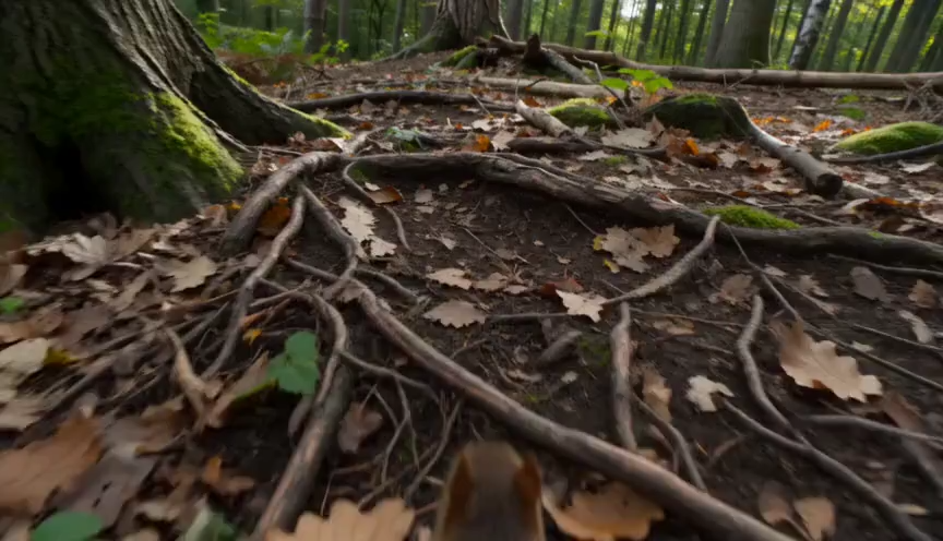 First-person POV of a squirrel in a forest, cinematic and realistic. Start on the forest ground with leaves, roots, moss, and soft sunlight. The camera is low and close to the ground, moving like the squirrel’s body. The squirrel begins running fast, making quick turns and small jumps over roots and plants. Then it climbs rapidly up a tree trunk, with the camera rising and tilting naturally with the squirrel’s movement. After that, the squirrel jumps onto a thick tree branch and stops. The camera stays still briefly, then turns left and right following the squirrel’s head movements, showing a high view down over the forest. Include realistic squirrel sounds, forest ambience, rustling leaves, and immersive natural audio. Cinematic, realistic animal motion, dynamic body-mounted POV, detailed bark and forest textures, natural light, film-quality atmosphere.